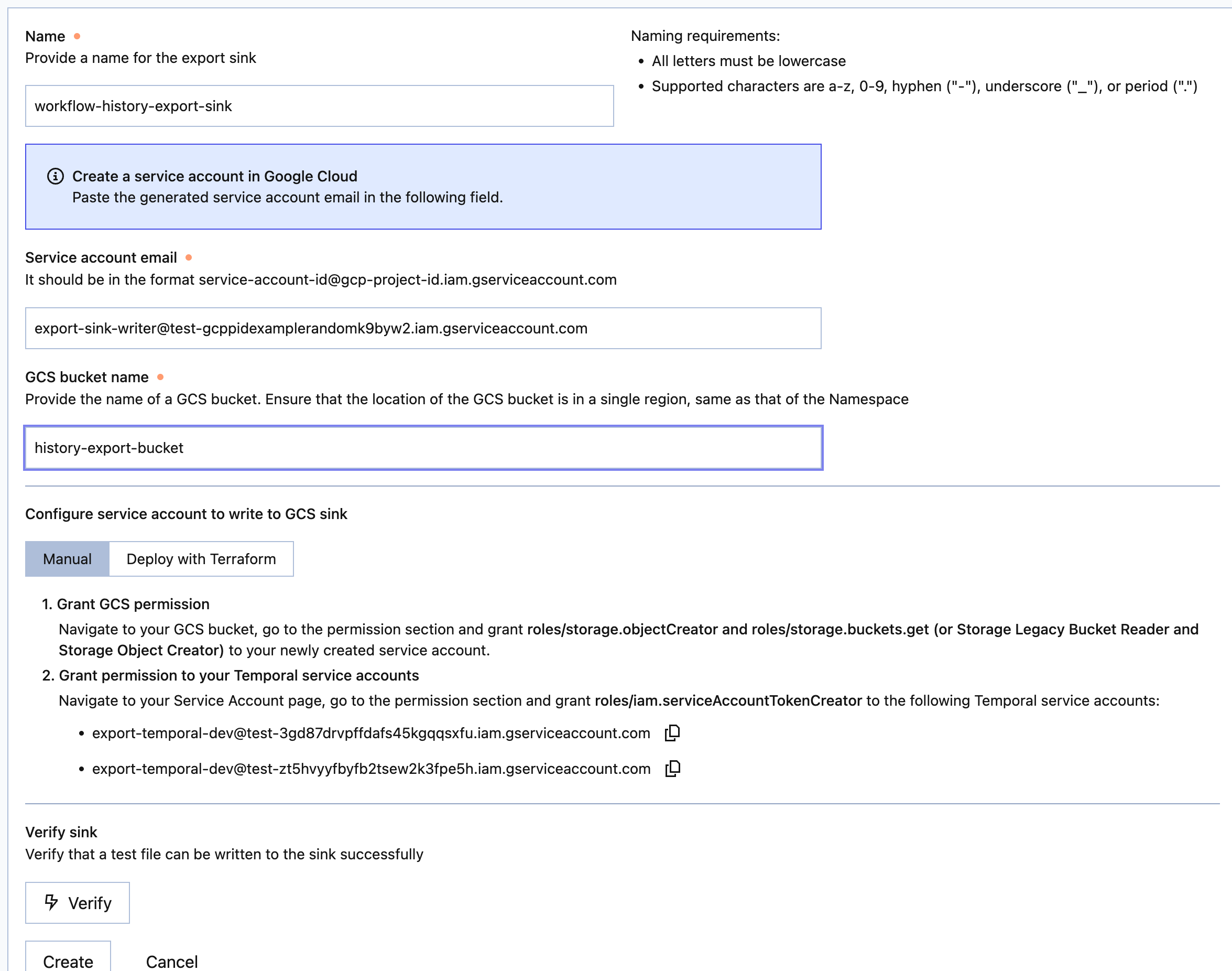 - Create a service account in the same project that grants Temporal permission to write to your GCS bucket.